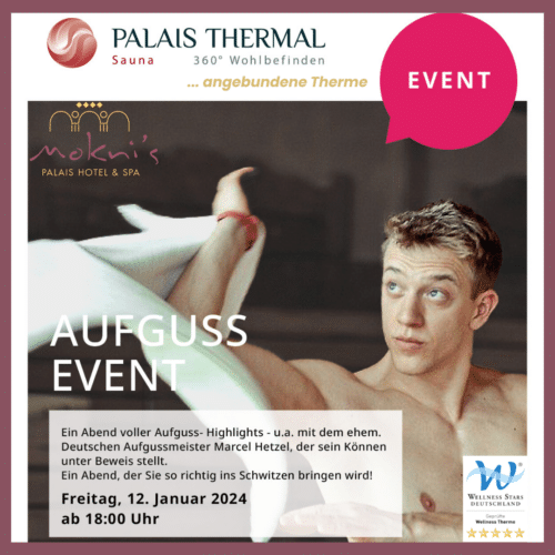Bei unserem Aufguss-Event legen sich unsere Saunameister voll ins Zeug und servieren Ihnen Überraschungsaufgüsse im Halbstundentakt. Als Highlight des Abends erwarten Sie dann Showaufgüsse des ehemaligen deutschen Aufgussmeister, Marcel Hetzel. Seine Aufgüsse folgen einer eigenen Choreografie, welche auch Sie so richtig ins Schwitzen bringen wird – wetten? Erleben Sie eine lange Sauna- und Badenacht bis 24 Uhr der Extraklasse! Gestartet wird um 18 Uhr.
