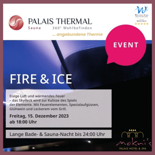 Eisige Luft und wärmendes Feuer – das Außendeck in der angebundenen Therme „Palais Thermal“ wird zur Kulisse des Spieles der Elemente!