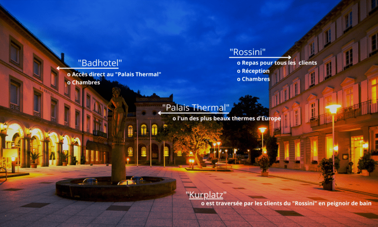 Tous les prix comprennent un copieux petit-déjeuner buffet au champagne ( dans le bâtiment « Rossini » ) et l’entrée gratuite au « Palais Thermal » connecté (dans le bâtiment « Badhotel ») ainsi qu’au « Vital Therme » qui se trouve à deux minutes à pied. .